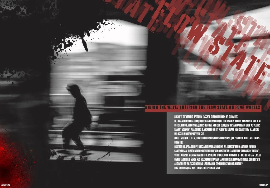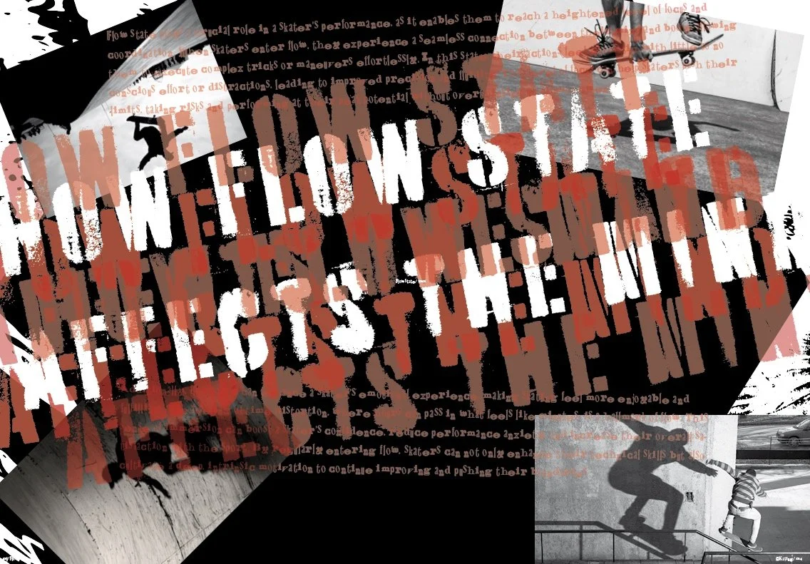 This magazine was a skateboarding design that mimics David Carlson’s style. This four-page magazine covers flow state and how this state affects skateboarders. The typeface is meant to give off a scratched-off or older look to the magazine. The repeated words behind the subtitle are supposed to make everything seem out of focus while the white title pops out. While the imagery in the back is supposed to represent a flow state.