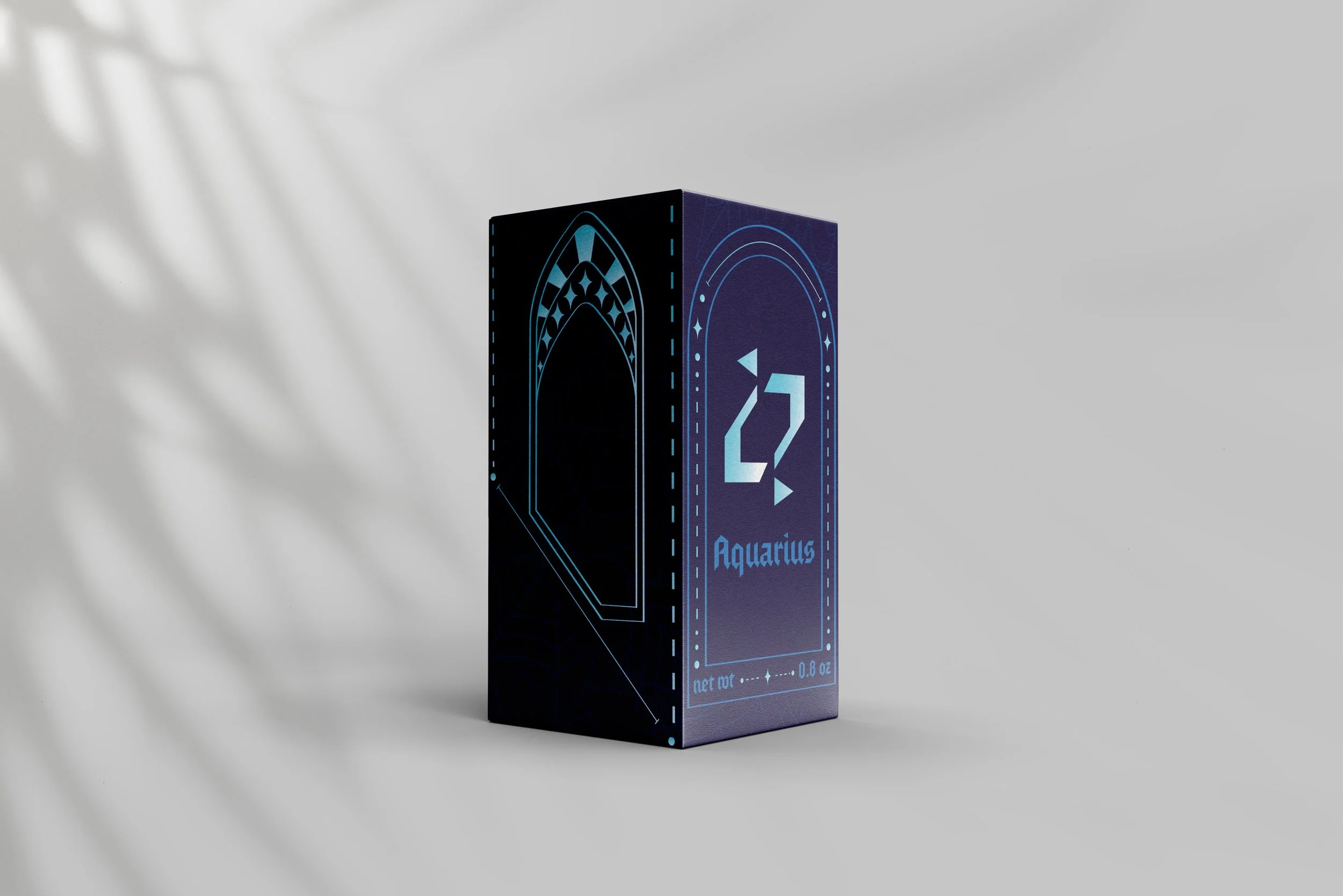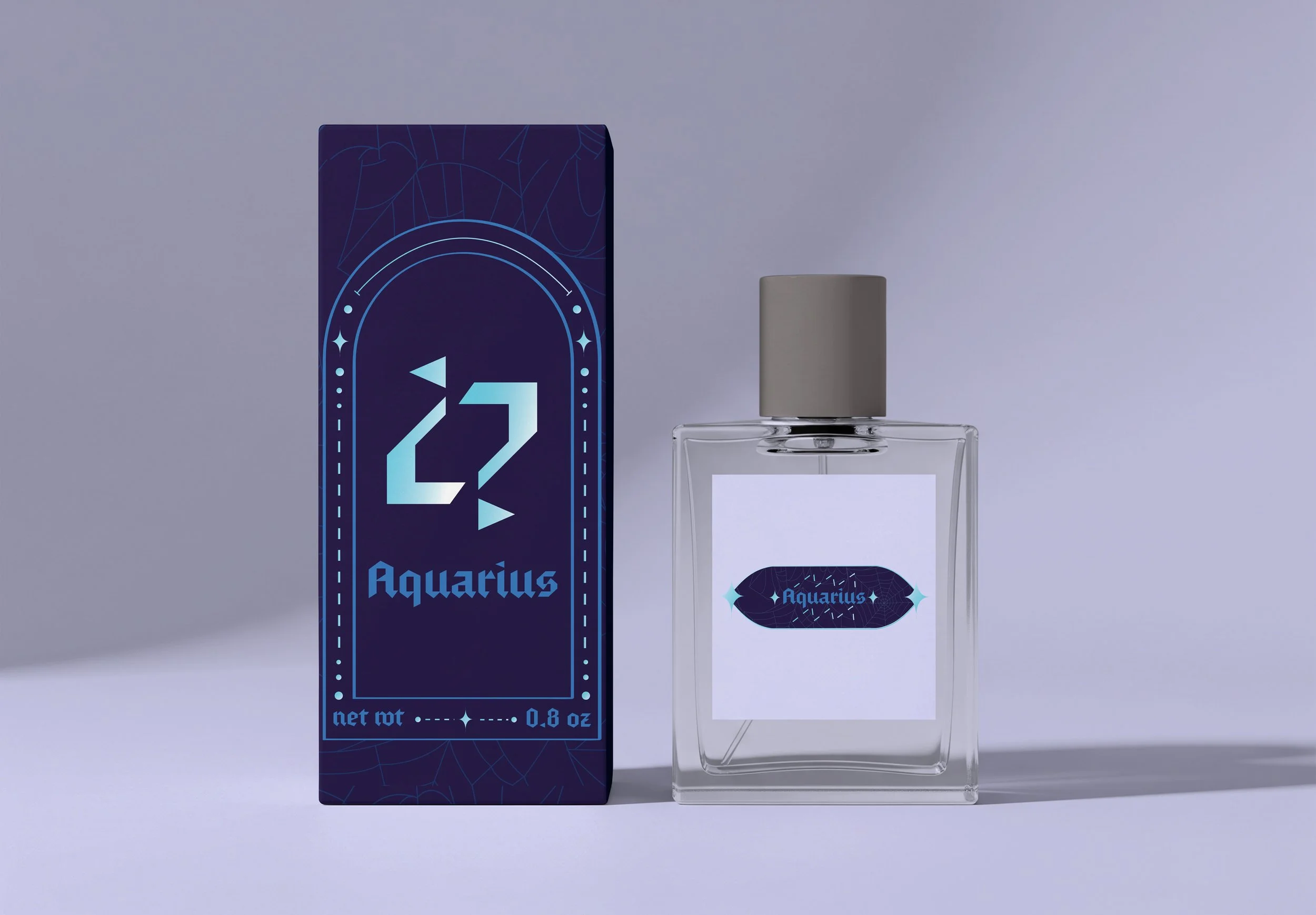The project was making perfume based on a zodiac. The zodiac sign chosen for this perfume is Aquarius. I went with two question marks for the logo and added the name of the zodiac for a secondary logo. The box itself has a subtle gothic theme that adds the uniqueness that is associated with the Aquarius sign. Also to amplify the uniqueness, the scent of the perfume is Vanilla, Orcids, and Grapefruit.
