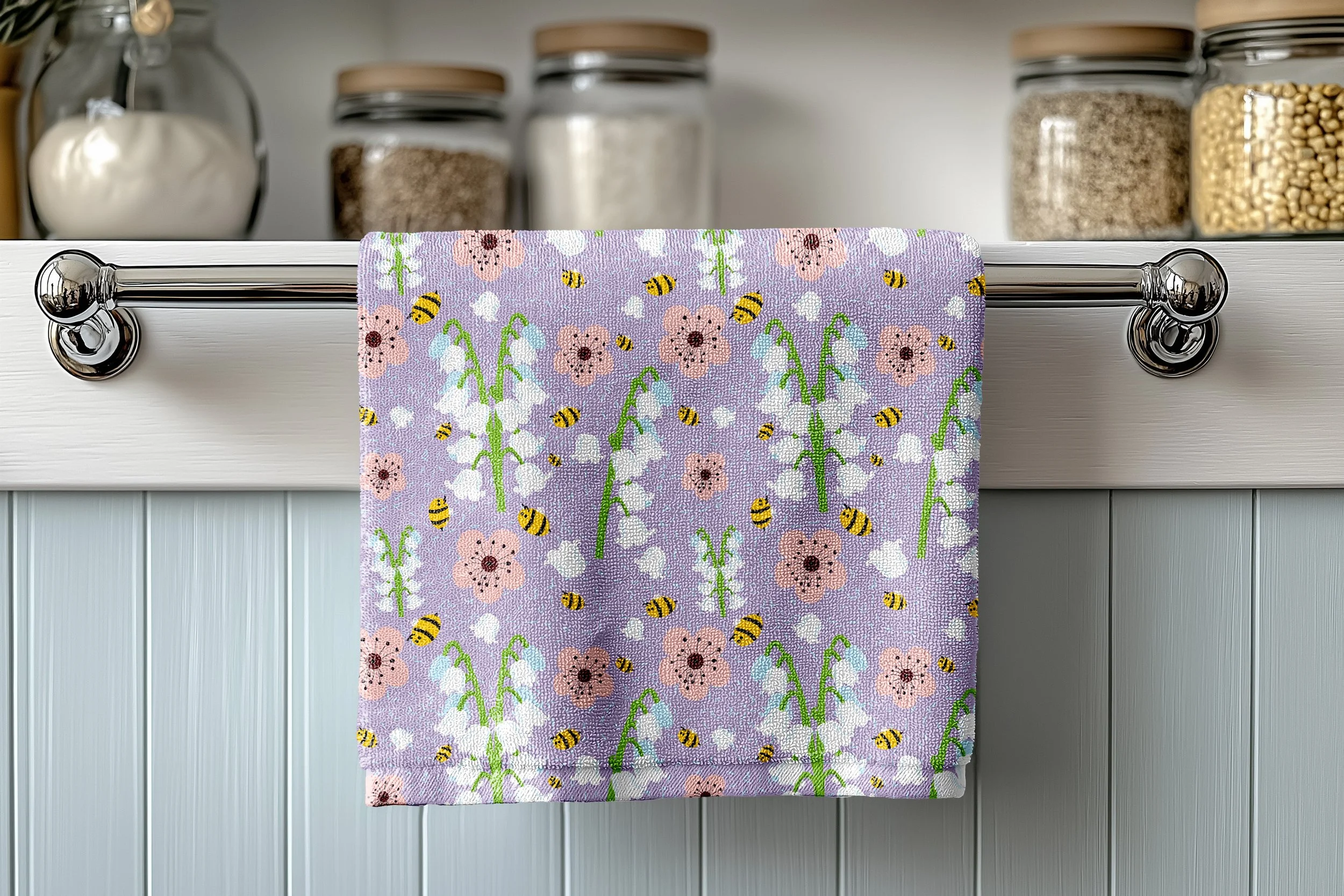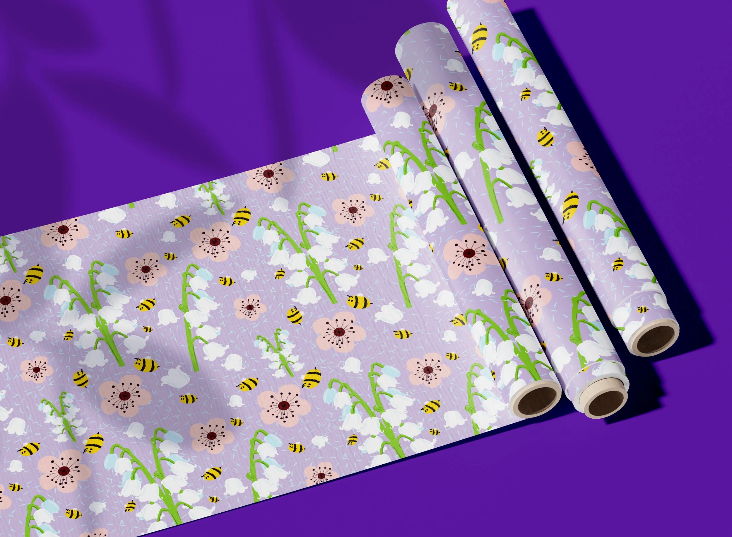 The Pattern is based on Spring. The main elements in this design are lily of the valley, cherry blossom flowers, and bees. The background element is a striped pattern that follows behind the bees. This is to show where they fly, or can also be interpreted as rain.
